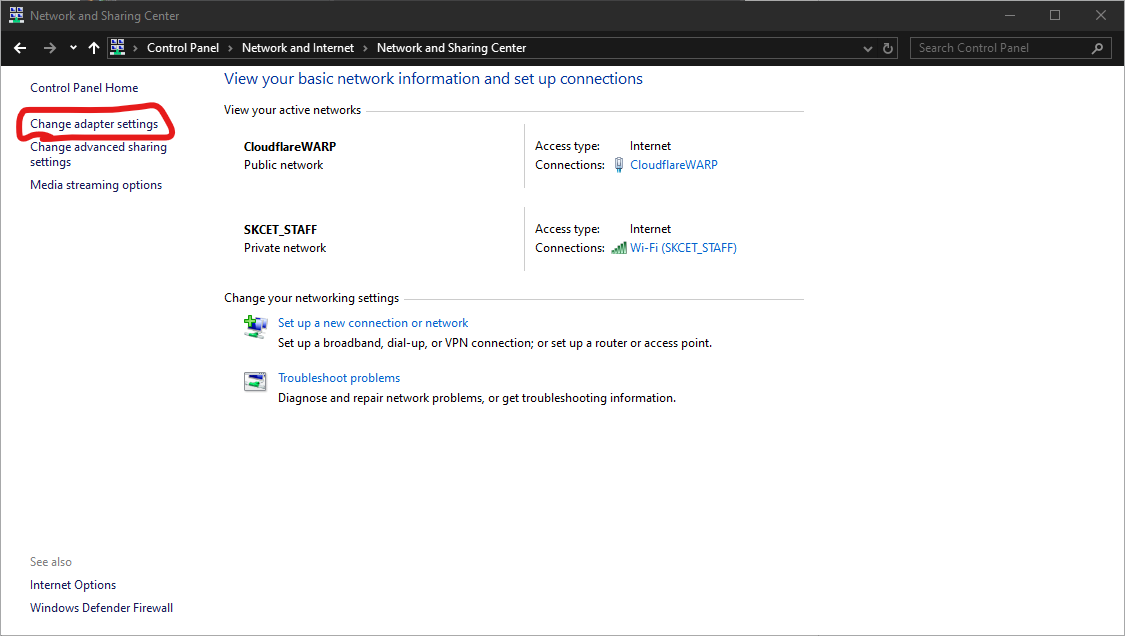 Open Network and Sharing Center in Control Panel, and click on “Change Adapter Settings”