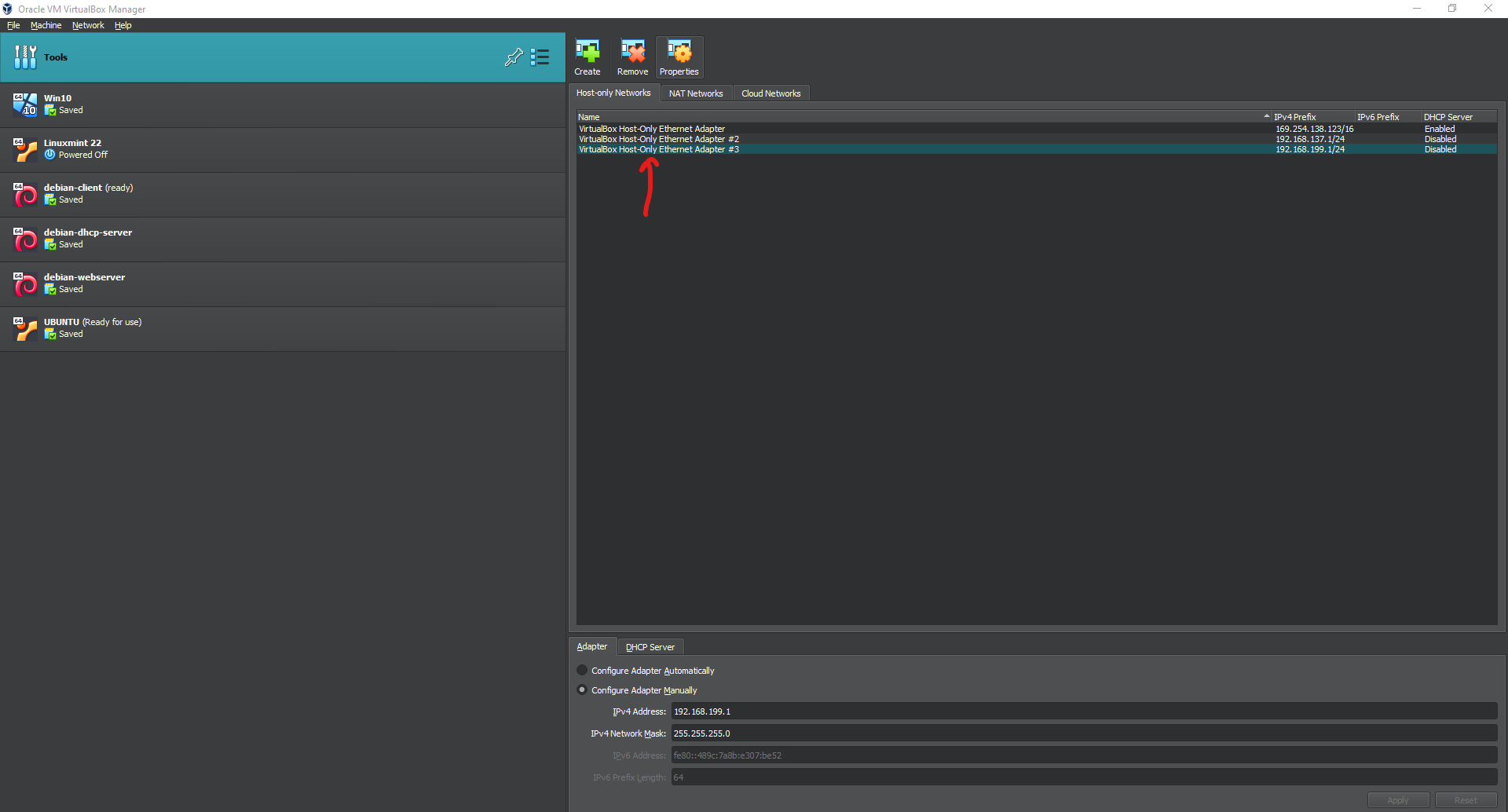 Here we have 192.168.199.1/24. Do not enable the DHCP server since we will create a VM for it.