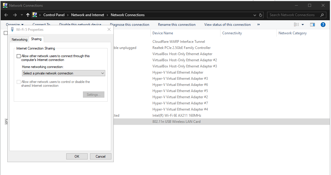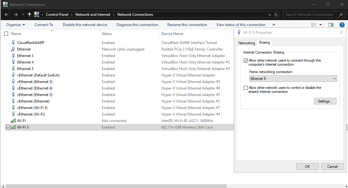 In my case it is Ethernet 5. Now right click on your real network interface you use to connect to the internet (in my case it is Wifi 5) and click on Properties and go to the Sharing tab.