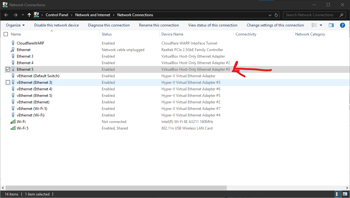 Select the “Allow other network…” checkbox and then select the virtualbox host only ethernet adapter (ethernet 5) in the dropdown.