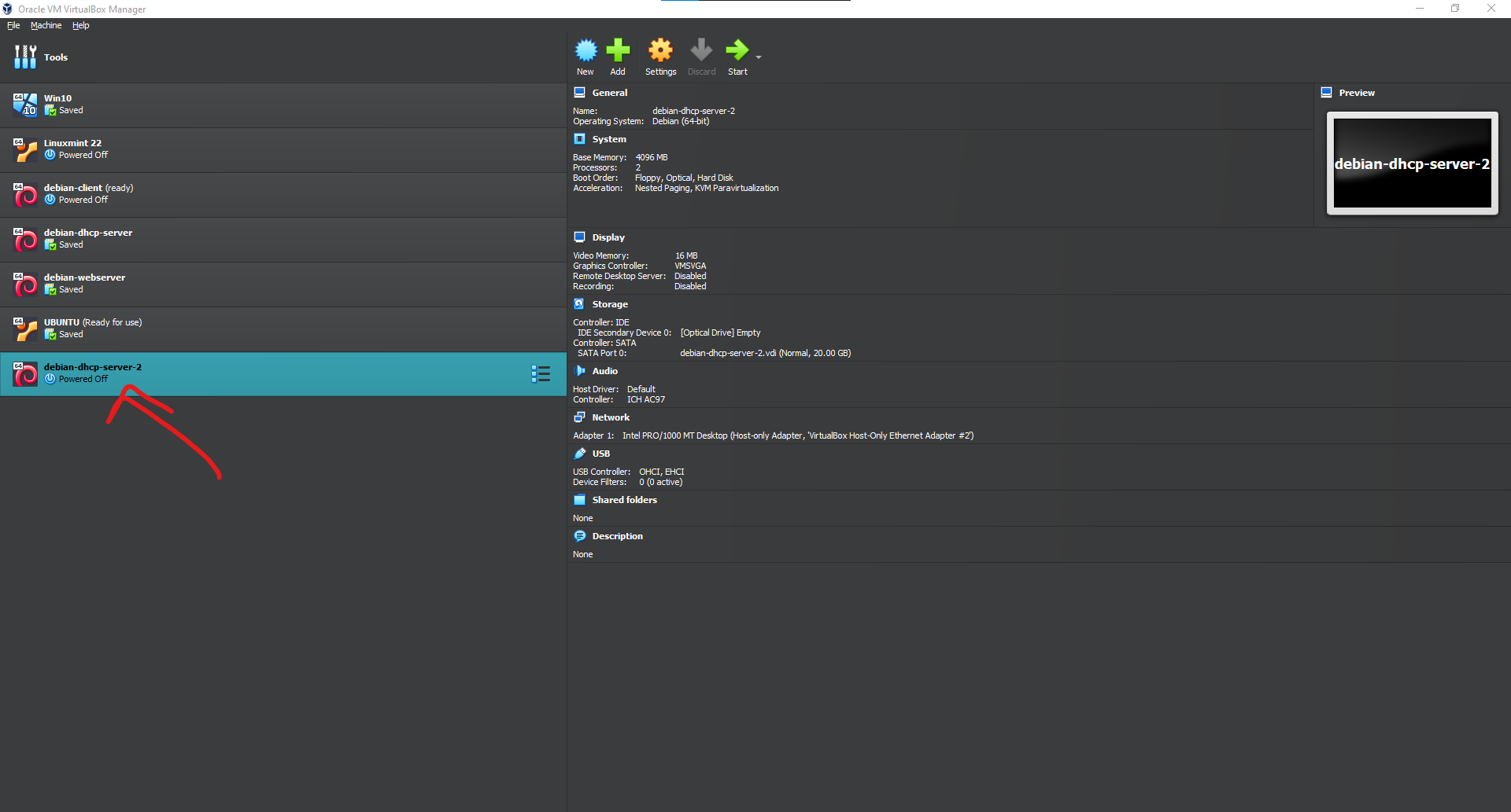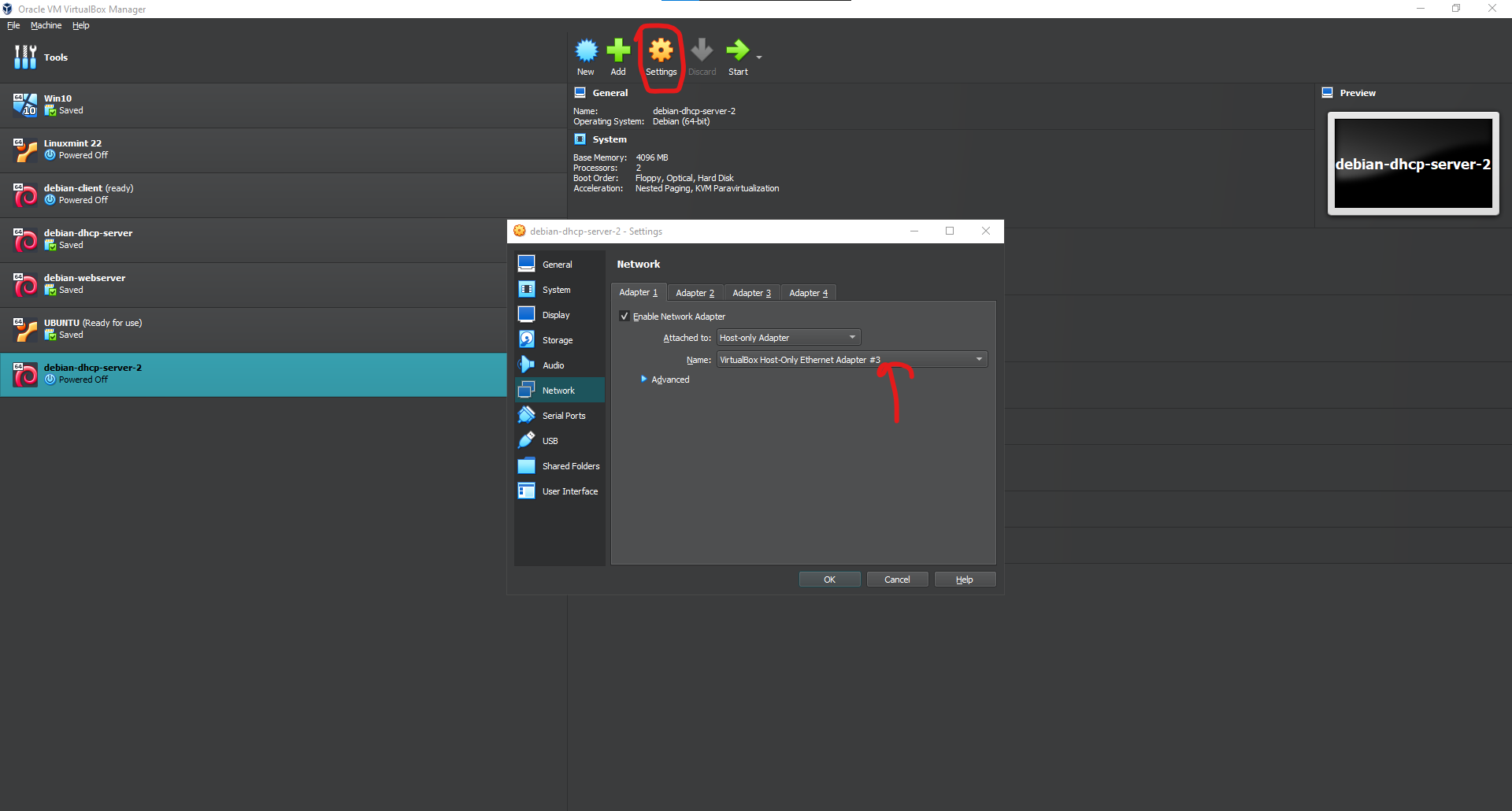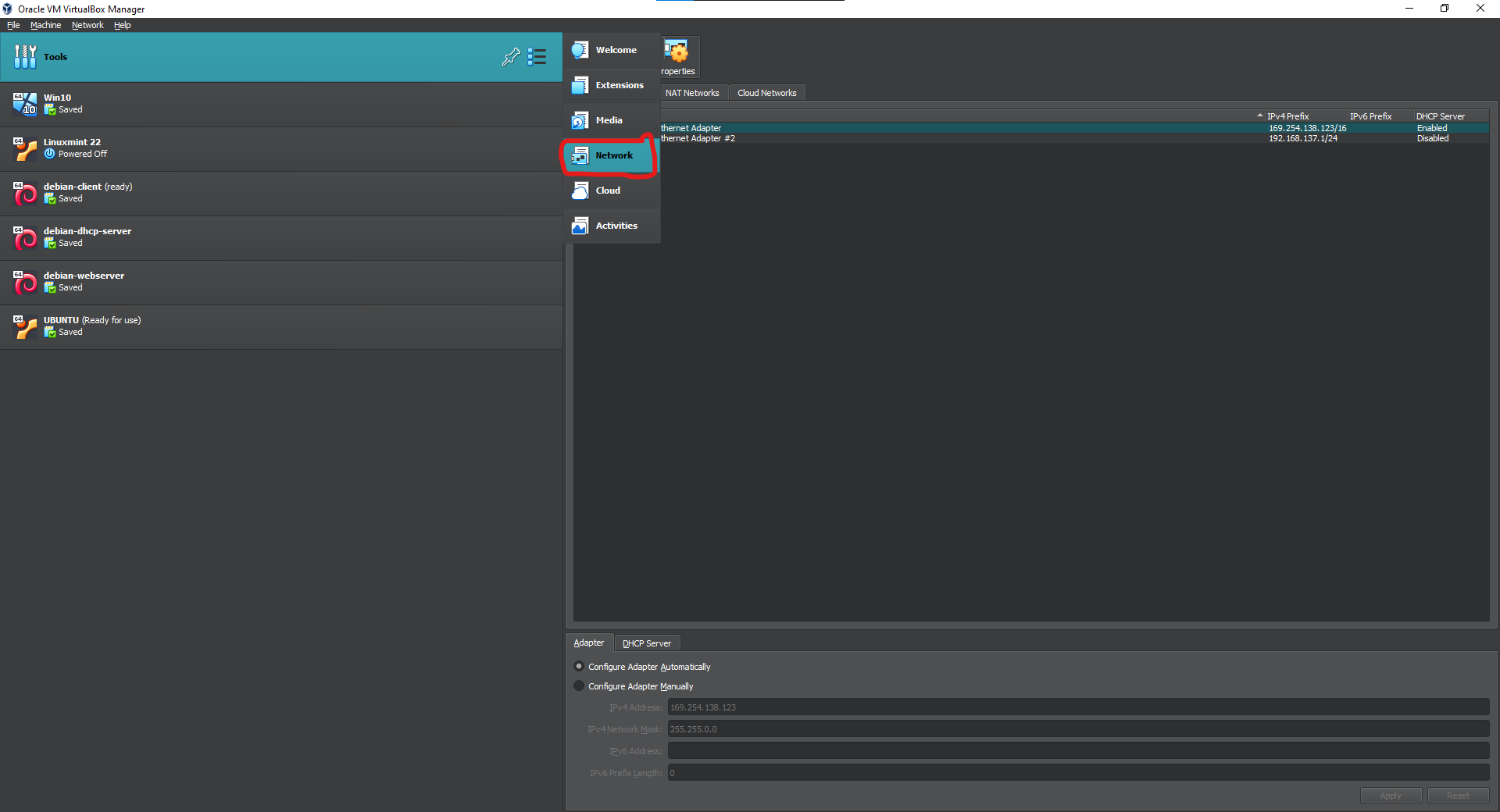 The first VM we need is a dhcp server, because we disabled the default DHCP server of virtualbox, we need a VM acting as the DHCP server to assign IP address to other clients. Before booting this up, click on the settings on the top center and click on Networking.