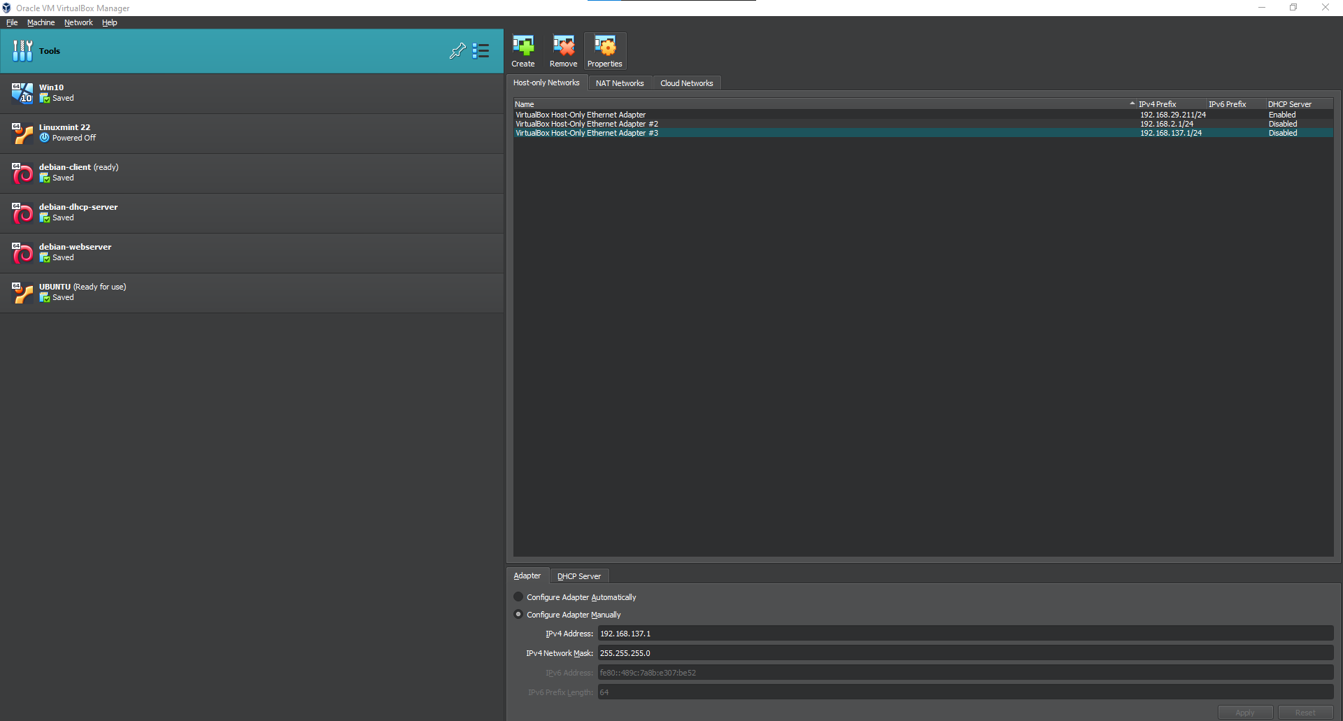 This means the host IP has been changed. Click yes and then go to virtual box manager, the host only network management part we were earlier, and select the newly created network. Make sure the IP address for the host is the same as in the popup window we got right above.