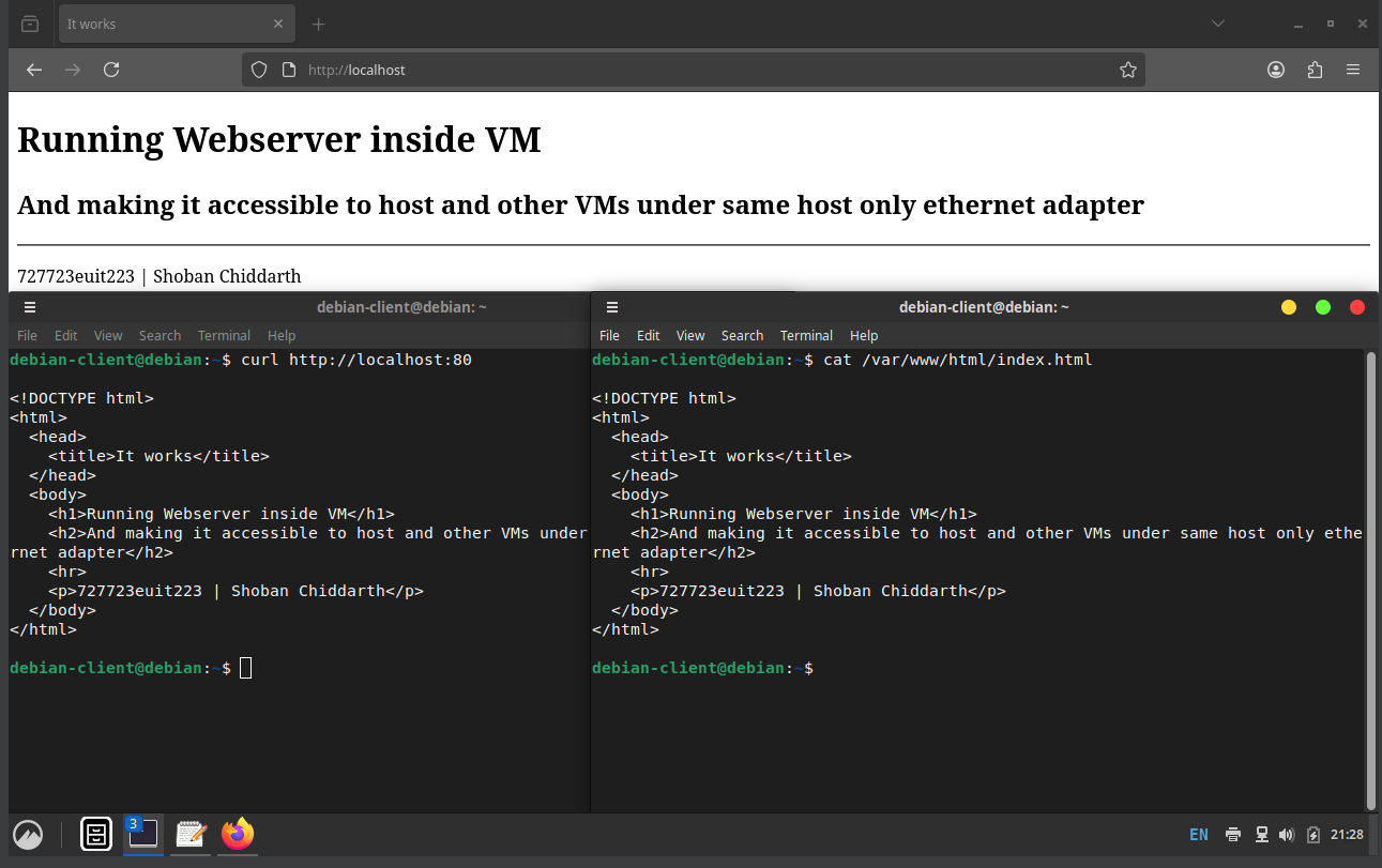 Now open localhost in a web browser inside the VM (or curl http://localhost:80) to check if you are able to see the html file at /var/www/html/index.html.