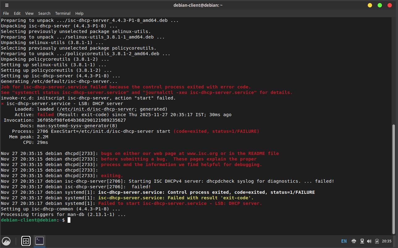 Run the command sudo apt install isc-dhcp-server. You will get some errors, it is expected.