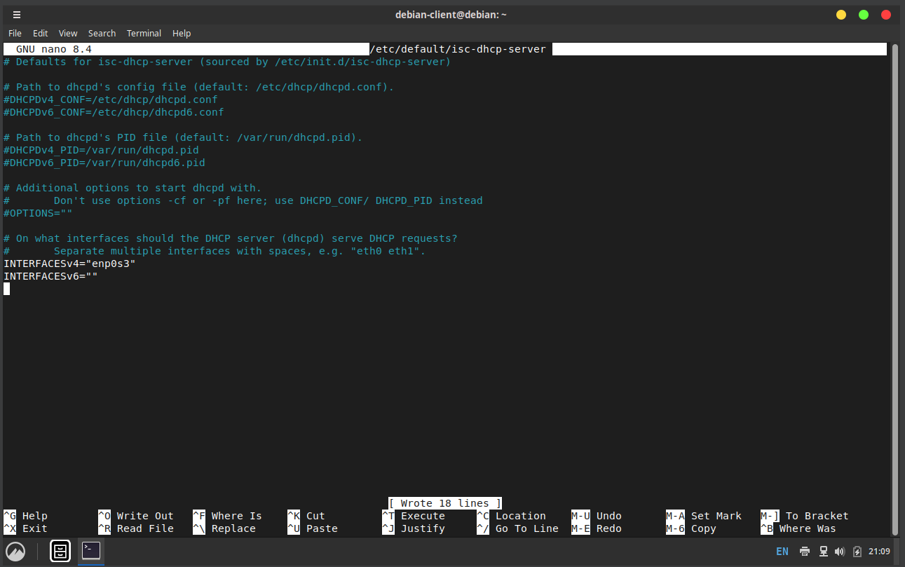 Now we have to specify which interface the isc-dhcp-server should operate on.