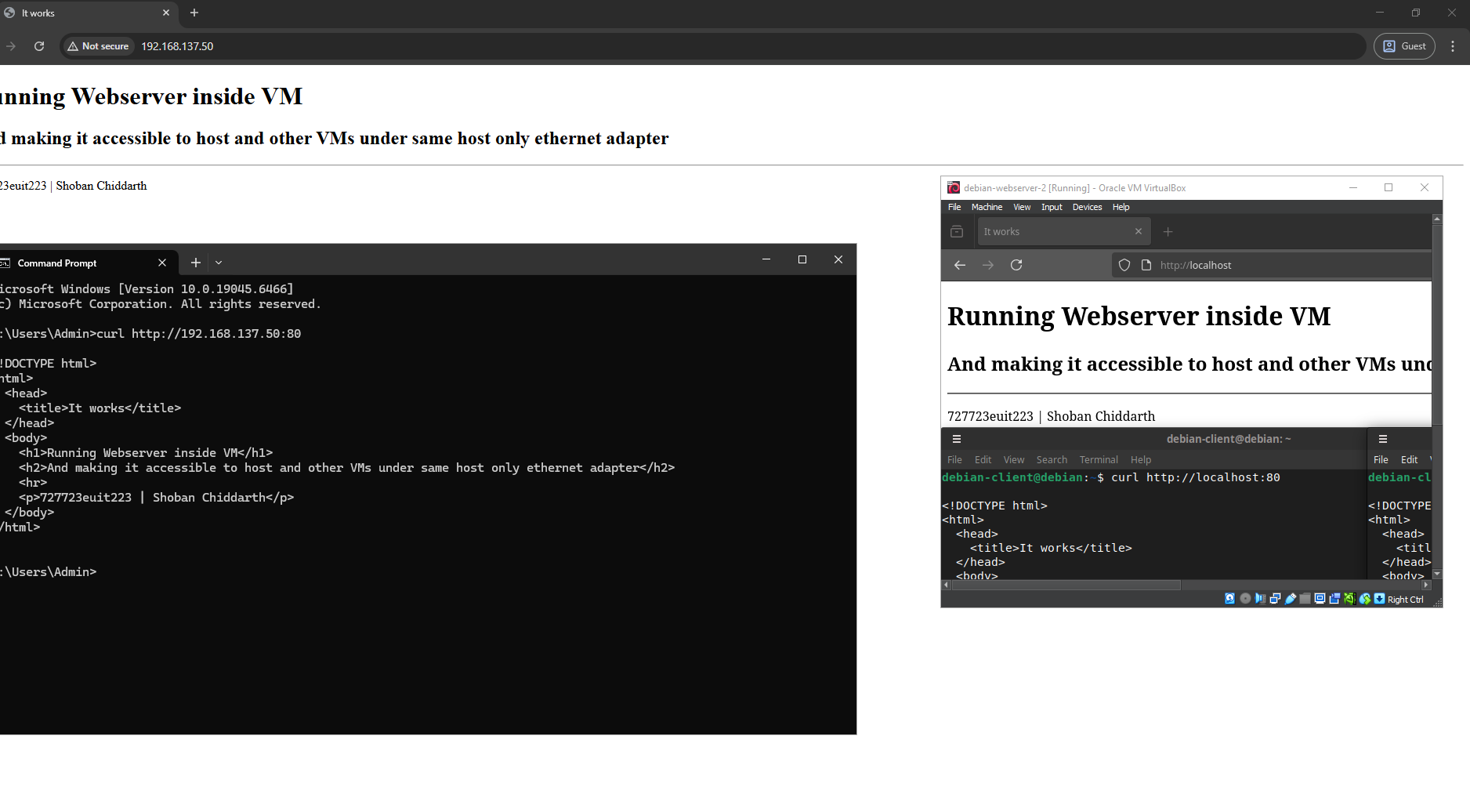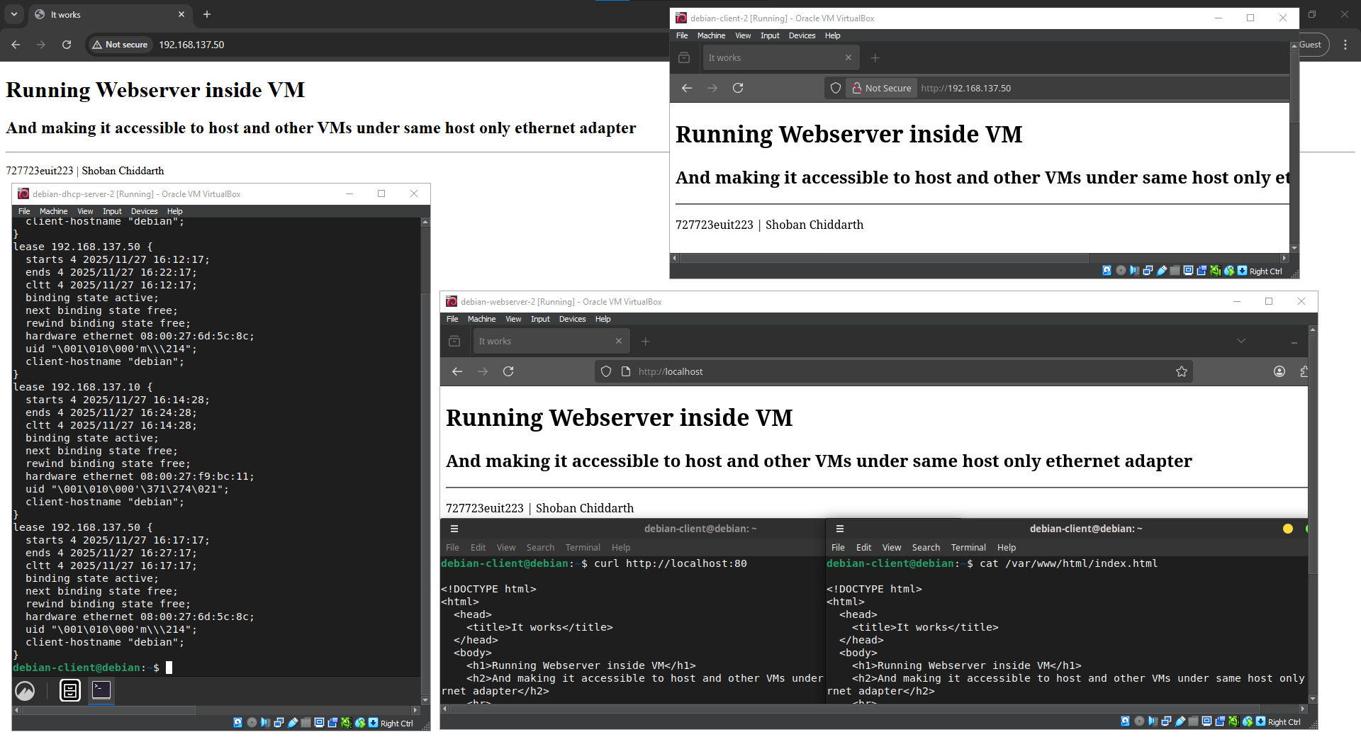 (Includes opening website on host, opening website on client VM, opening localhost on web server VM, showing /var/www/html/index.html file in host VM, showing dhcp leases file on DHCP server VM.