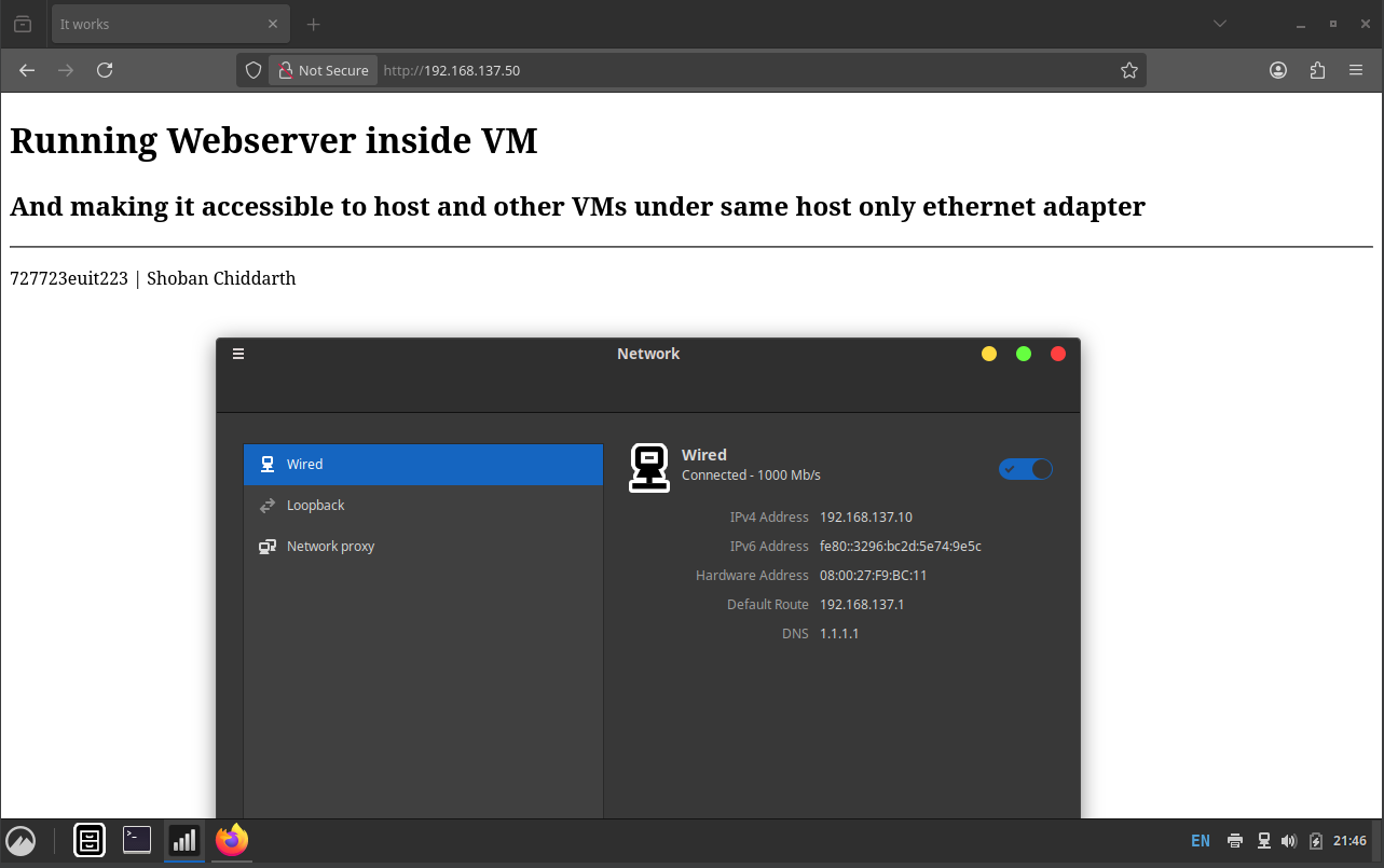My client’s IP is 192.168.137.10. But we do not need this information. Now open a web browser in the client and visit http://192.168.137.50 (the IP of the webserver).