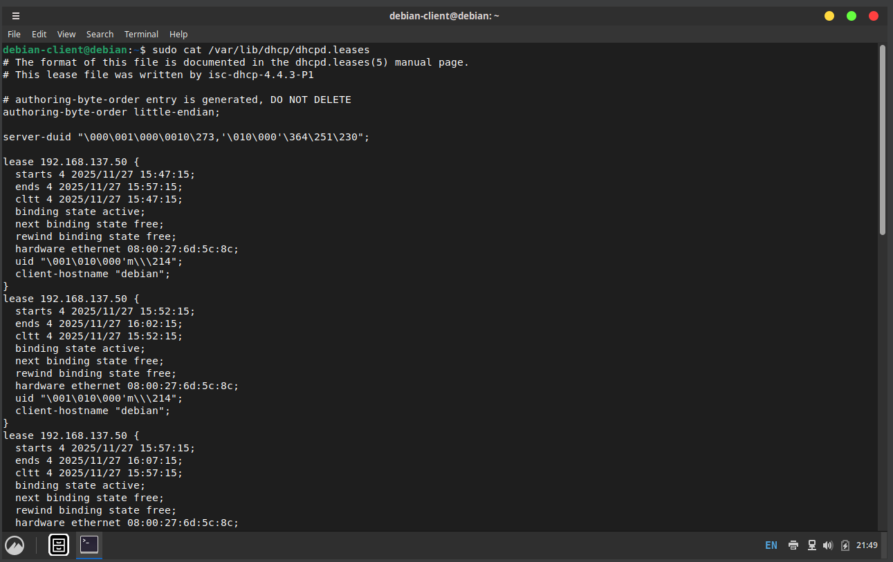 Do it another time for the client and make sure the network adapter settings are same for both of them, compared to the dhcp server.
