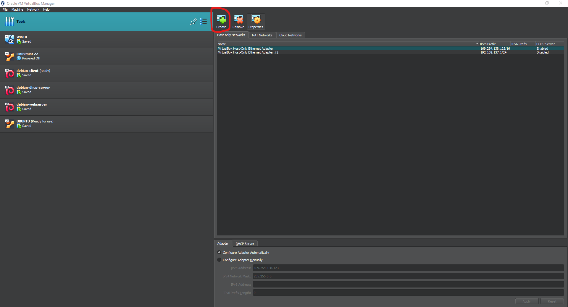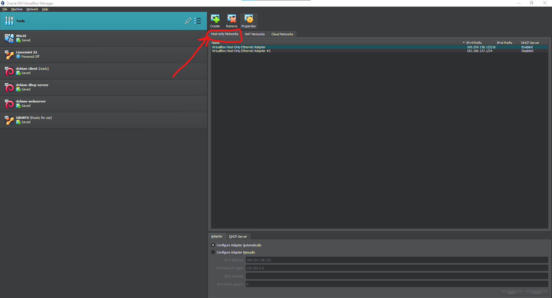 Open Virtualbox Manager -> Tools -> 3 lines -> Network -> Host Only Networks